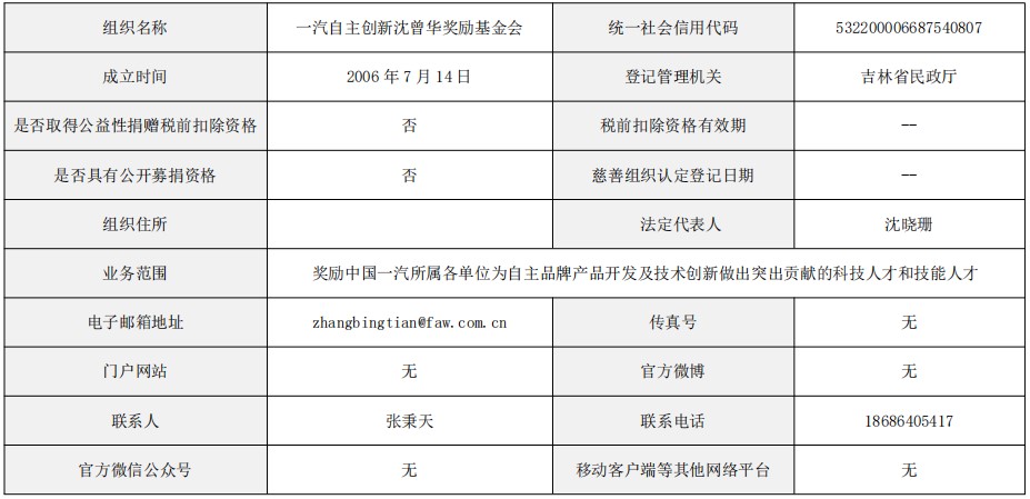 一汽自主創(chuàng)新沈曾華獎勵基金會信息公開