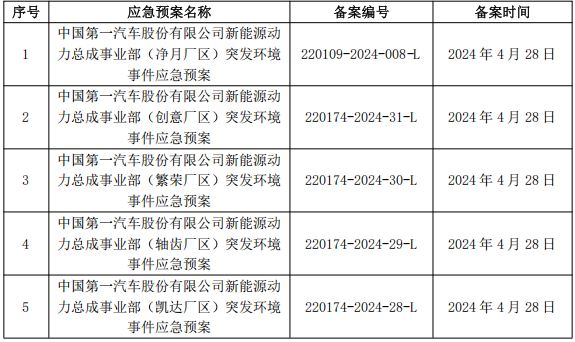 2、一汽旗新動(dòng)力(長(zhǎng)春)科技有限公司突發(fā)環(huán)境事件應(yīng)急預(yù)案及備案表(見附件4-附件10)。