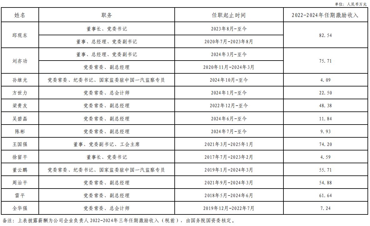 中國(guó)第一汽車集團(tuán)有限公司企業(yè)負(fù)責(zé)人2022-2024年任期激勵(lì)收入情況